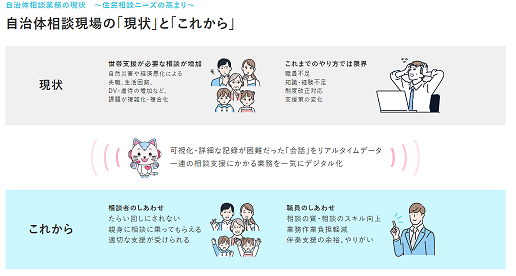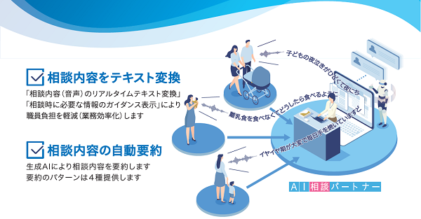 自治体における「相談業務」を対象に、「音声認識」や「生成AI」の活用で、相談員の業務を軽減・支援するトータルサービスです。